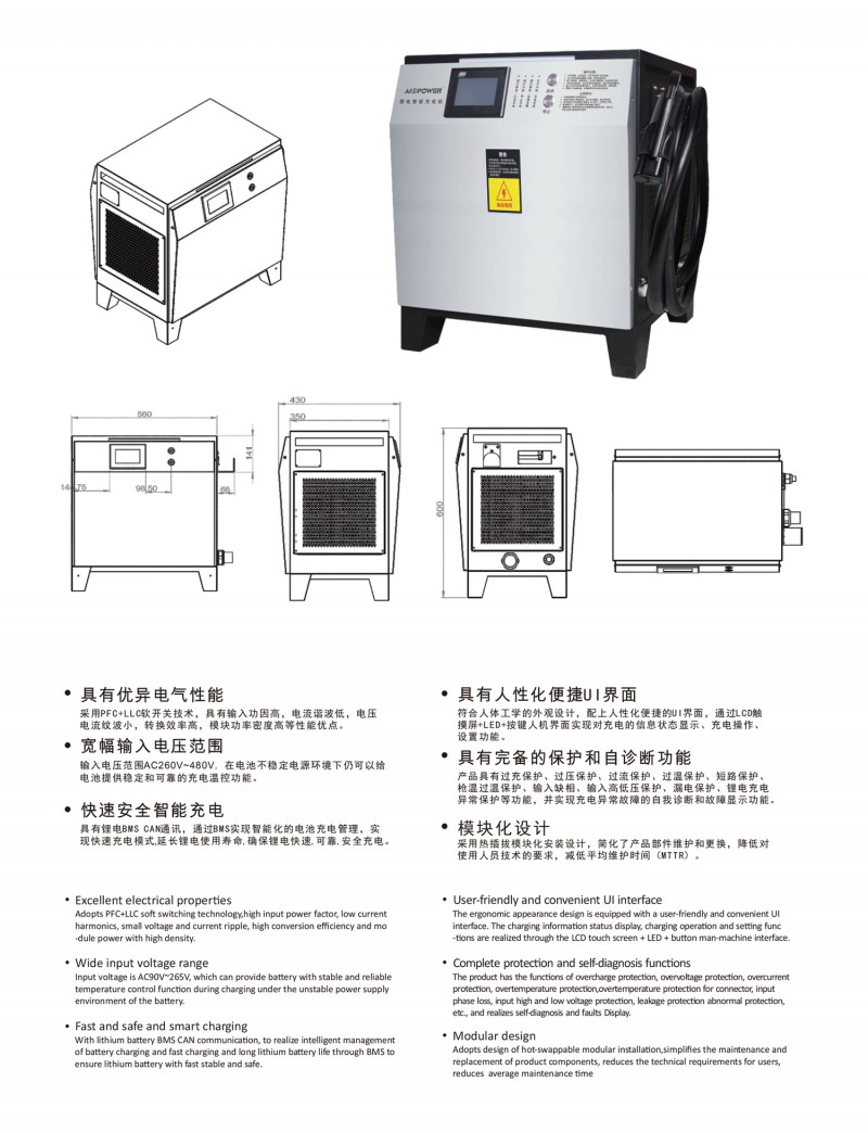 觸摸屏智能操作設計:告別傳統按鍵方式,給您帶來更現代更具科技智能的操作體驗 自動充電:插槍自動充電,簡化充電流程,便于操作 兼容性高:80V200A兼容48V200A充電 多重保護: 輸出短路,過流過壓保護,反接保護,電流導管保護等多重保護 預約充電功能:避開高峰用電時段,有效節省成本 雙語切換:中英文雙語隨需切換,跨越語言障礙,與世界接軌 人性化設計:充電機背板內部附部件明細及產品接線圖,方便客戶可更清楚的了解產品,便于維修,提高售后時效 獨特設計: 內置電磁鎖驅動模塊,防止臨時斷電鎖槍 使用壽命更長:功率模塊預留20%空間,提高模塊的使用壽命 出色內部結構: 內部結構左右出風,內部電路不容易積粉塵,提高充電機壽命