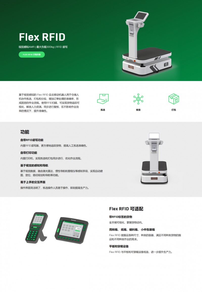 基于視覺感知的 Flex RFID 自主移動機器人用于倉儲人機協作揀選、打包和分撿,增加訂單處理的準確率,形成固定的作業流程。使用RFID掃描,可實現貨物追蹤可視化,解放人力資源。同步進行復核,在不影響作業效率的情況下,提升準確性。