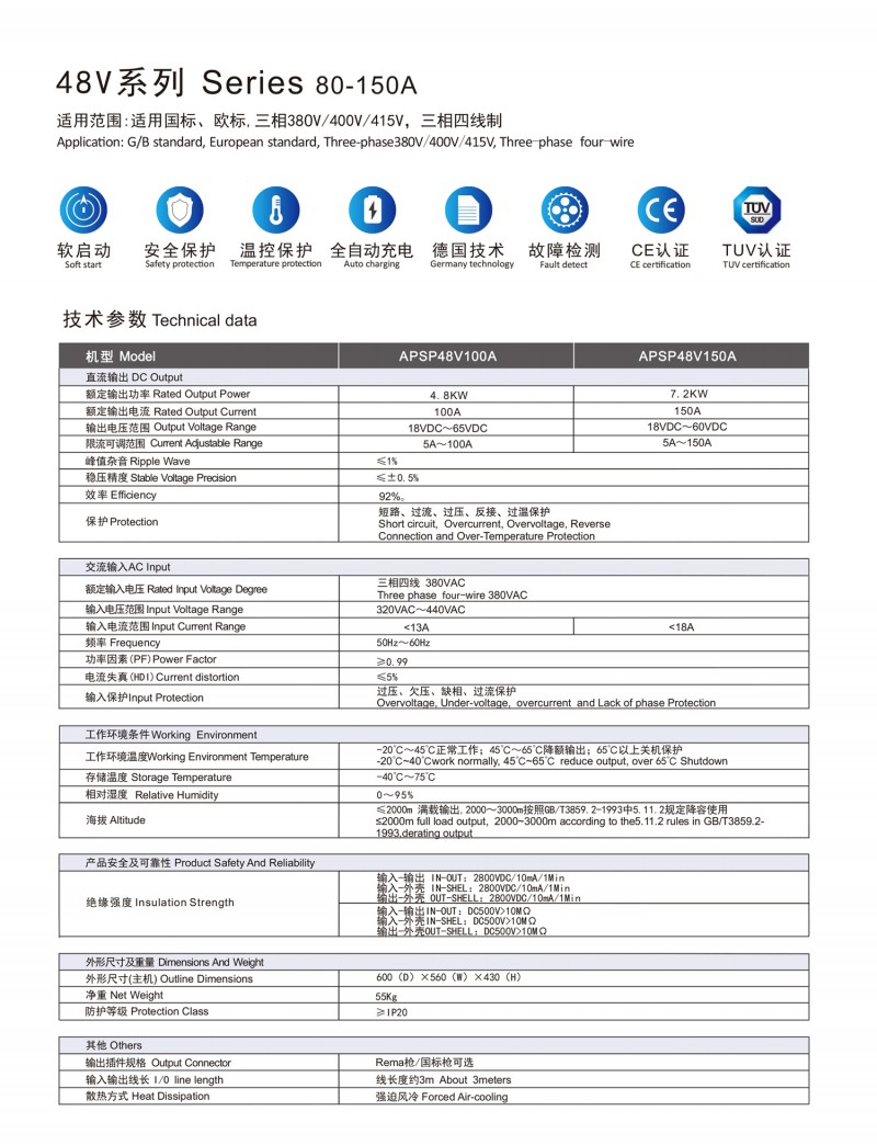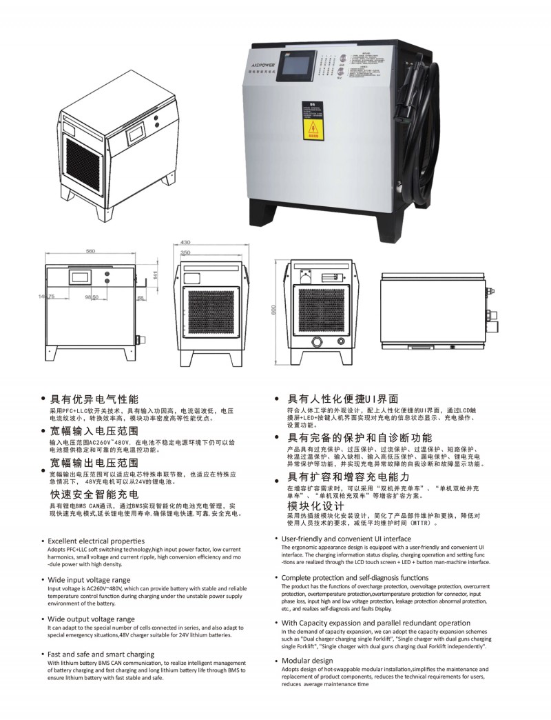 觸摸屏智能操作設(shè)計(jì):告別傳統(tǒng)按鍵方式,給您帶來(lái)更現(xiàn)代更具科技智能的操作體驗(yàn) 自動(dòng)充電:插槍自動(dòng)充電,簡(jiǎn)化充電流程,便于操作 兼容性高:80V200A兼容48V200A充電 多重保護(hù): 輸出短路,過(guò)流過(guò)壓保護(hù),反接保護(hù),電流導(dǎo)管保護(hù)等多重保護(hù) 預(yù)約充電功能:避開(kāi)高峰用電時(shí)段,有效節(jié)省成本 雙語(yǔ)切換:中英文雙語(yǔ)隨需切換,跨越語(yǔ)言障礙,與世界接軌 人性化設(shè)計(jì):充電機(jī)背板內(nèi)部附部件明細(xì)及產(chǎn)品接線(xiàn)圖,方便客戶(hù)可更清楚的了解產(chǎn)品,便于維修,提高售后時(shí)效 獨(dú)特設(shè)計(jì): 內(nèi)置電磁鎖驅(qū)動(dòng)模塊,防止臨時(shí)斷電鎖槍 使用壽命更長(zhǎng):功率模塊預(yù)留20%空間,提高模塊的使用壽命 出色內(nèi)部結(jié)構(gòu): 內(nèi)部結(jié)構(gòu)左右出風(fēng),內(nèi)部電路不容易積粉塵,提高充電機(jī)壽命