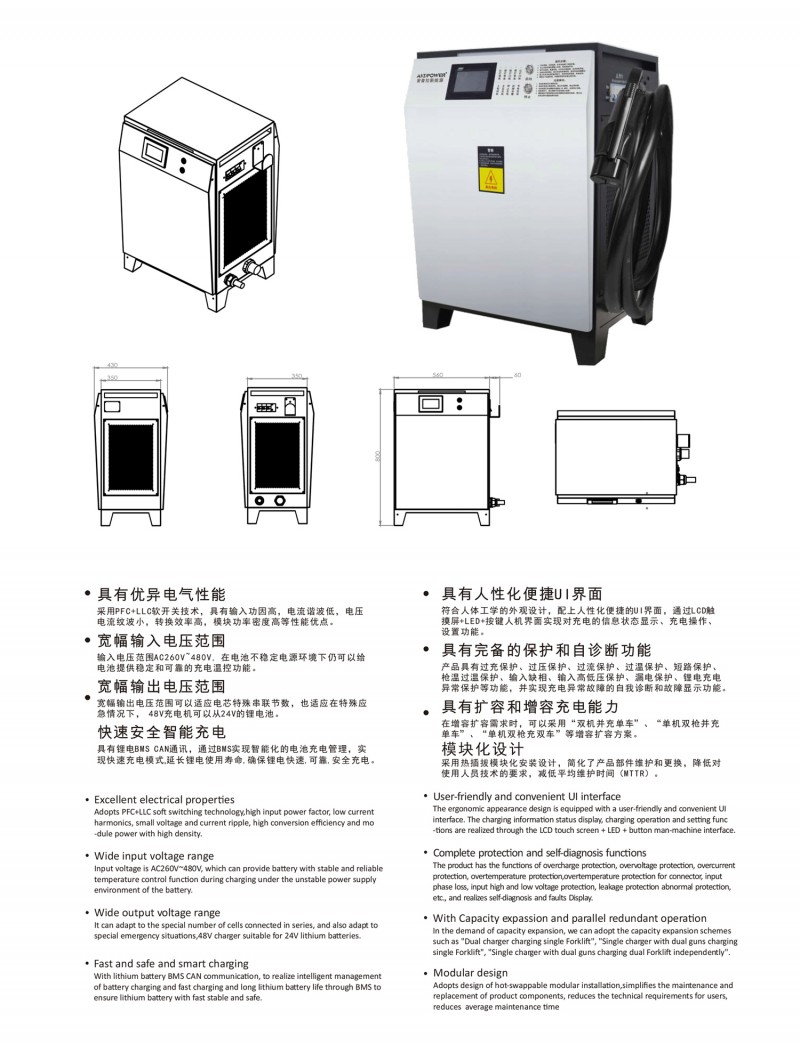 觸摸屏智能操作設計:告別傳統按鍵方式,給您帶來更現代更具科技智能的操作體驗 自動充電:插槍自動充電,簡化充電流程,便于操作 兼容性高:80V200A兼容48V200A充電 多重保護: 輸出短路,過流過壓保護,反接保護,電流導管保護等多重保護 預約充電功能:避開高峰用電時段,有效節省成本 雙語切換:中英文雙語隨需切換,跨越語言障礙,與世界接軌 人性化設計:充電機背板內部附部件明細及產品接線圖,方便客戶可更清楚的了解產品,便于維修,提高售后時效 獨特設計: 內置電磁鎖驅動模塊,防止臨時斷電鎖槍 使用壽命更長:功率模塊預留20%空間,提高模塊的使用壽命 出色內部結構: 內部結構左右出風,內部電路不容易積粉塵,提高充電機壽命