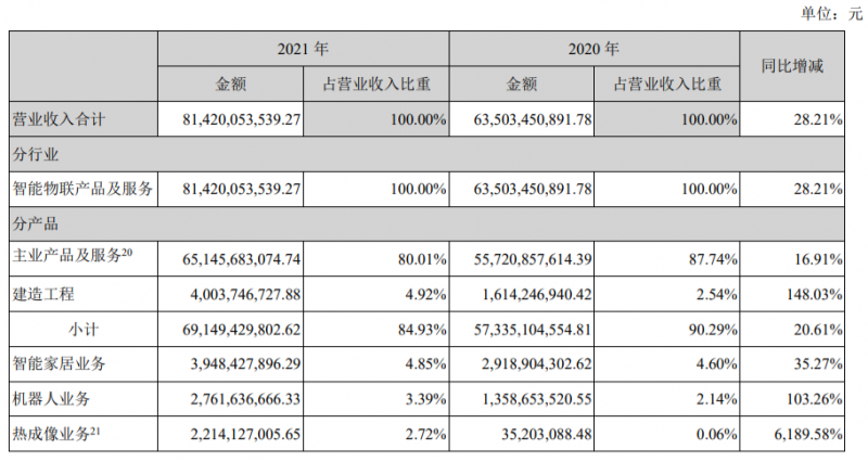 2015年以來,海康威視鼓勵(lì)內(nèi)部員工創(chuàng)新創(chuàng)業(yè),建立內(nèi)部創(chuàng)新跟投制度,先后成立了8個(gè)創(chuàng)新業(yè)務(wù)。2021年,有5個(gè)創(chuàng)新業(yè)務(wù)的收入超過10億、凈利潤為正。其中,公司智能家居業(yè)務(wù)營收達(dá)到了39億元,同比增長35.27%、機(jī)器人業(yè)務(wù)營收達(dá)到了27億元,同比增長103%、熱成像業(yè)務(wù)營收達(dá)到22億元、同比增長6189.58%。年報(bào)顯示,螢石網(wǎng)絡(luò)已經(jīng)遞交IPO申請;海康機(jī)器人擬分拆上市,相關(guān)籌備工作正在推進(jìn)中。