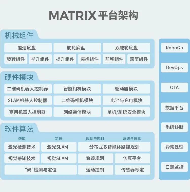 極智嘉在2019年便啟動研發(fā)全系列機器人的統(tǒng)一平臺MATRIX,該平臺匯集了極智嘉在機器人軟硬件方面的眾多先進技術,在工業(yè)級ARM SoC上整合了多傳感器間高精度時間同步、2D與3D激光SLAM、視覺與激光感知、軌跡規(guī)劃與運動控制、自動化標定與在線標定以及OTA等關鍵技術和功能模塊,同時在架構上支持無縫擴展室外場景。