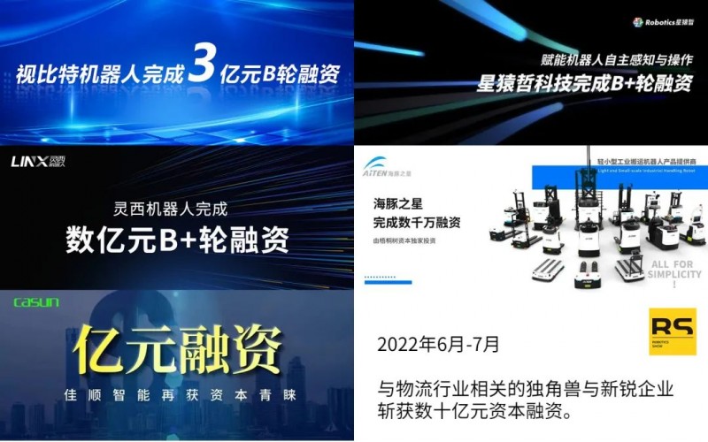 敏銳的資本最先觀察到這波新的移動機(jī)器人(AGV/AMR)與物流相關(guān)機(jī)器人爆發(fā)苗頭。據(jù)不完全統(tǒng)計(jì),就2022年6月與7月間,與物流行業(yè)相關(guān)的獨(dú)角獸與新銳企業(yè)斬獲數(shù)十億元資本融資:視比特(展位號:8.1H C198)完成3億元B輪融資,星猿哲科技(展位號:7.1H E230)完成融資金額約4000萬美元的B+輪融資,靈西機(jī)器人(展位號:8.1H C062)完成數(shù)億元B+輪融資,佳順智能(展位號:7.1H D125)再獲近億元人民幣的融資,海豚之星(展位號:7.1H E175)宣布完成數(shù)千萬元融資......均是千萬級以上投資。