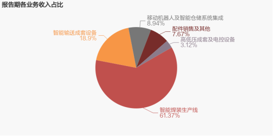從業(yè)務(wù)結(jié)構(gòu)來看,“智能焊裝生產(chǎn)線”是公司營(yíng)業(yè)收入的主要來源。具體而言,“智能焊裝生產(chǎn)線”營(yíng)業(yè)收入為4.18億元,營(yíng)收占比為61.4%,毛利率為13%。