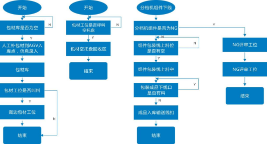 玻璃原片上料—EVA裁切鋪設(shè)—自動(dòng)上模板—自動(dòng)串焊—自動(dòng)擺串—上背玻—EL測(cè)試單元—緩存堆棧—混進(jìn)定位單元—層壓機(jī)—混出定位單元—自動(dòng)修邊—翻轉(zhuǎn)檢查單元—自動(dòng)裝框—上料機(jī)—固化—清洗--下料機(jī)—絕緣耐壓測(cè)試—IV測(cè)試單元—自動(dòng)分檔—自動(dòng)包裝—自動(dòng)出入庫(kù)等。組件生產(chǎn)AGV自動(dòng)小車(chē)自動(dòng)按需運(yùn)輸流程大致流程如下: