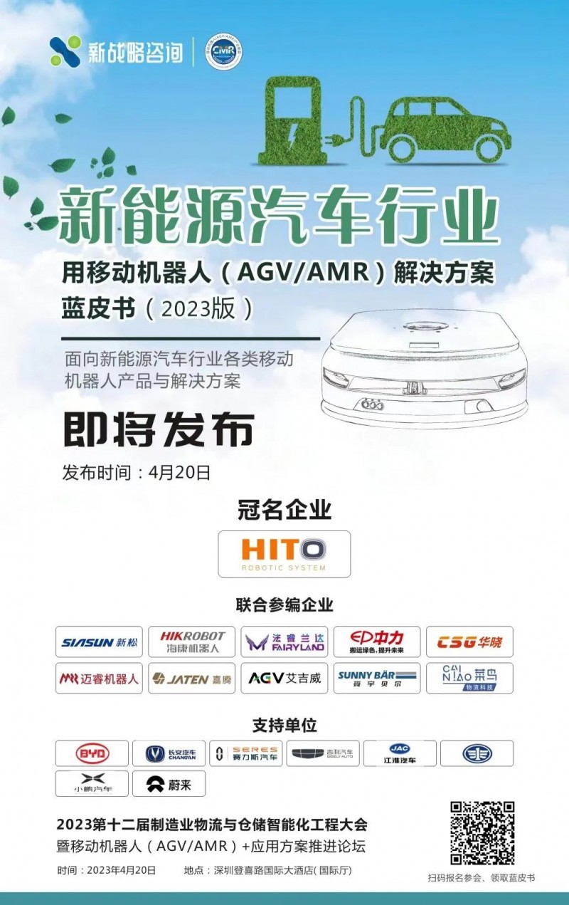 4月20日,在2023第十二屆制造業物流與倉儲智能化工程大會”上,《新能源汽車行業用移動機器人(AGV/AMR)解決方案藍皮書(2023版)》將正式發布!