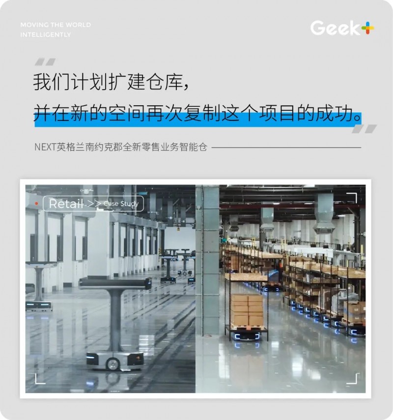 全球倉儲機器人專家極智嘉(Geek+)宣布,成功助力英國服裝和家居時尚品零售巨頭NEXT,在其占地45,000平方米的Dearne Valley Pallet履約中心倉庫中,通過部署250臺AMR機器人實現NEXT電商業務貨到人揀選及訂單分揀自動化。