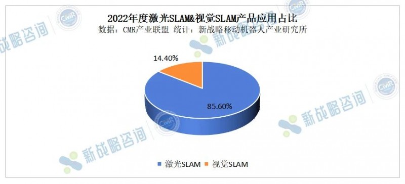 即“自主移動機器人”)是工業應用移動機器人的一個品類,主要指應用在工業制造及物流領域的自主移動機器人,主要包含激光SLAM和視覺SLAM兩種技術路線。2022年AMR落地規模不斷擴大,主要集中在工業制造領域,相對于倉儲物流,工業制造對于移動機器人產品的柔性化程度要求相對較高,因此也更偏好無軌導航的AMR產品。根據聯盟預測,未來三年內,AMR機器人將在整個工業移動機器人市場中占比有望超過50%,真正實現智能化的移動機器人應用。市場格局方面,目前國內超過85%的AGV本體企業都擁有自然導航類產品,且企業數量還在不斷增多中,這其中有專注于自然導航產品的企業,也有傳統的AGV、倉儲機器人廠商及物流集成商等,主要代表廠商有鐳神智能、迦智科技、優艾智合、藍芯科技、新松機器人、斯坦德、玖物互通、極智嘉、海康機器人、未來機器人、曠視科技等企業。從技術方向來看,AMR目前主要是依靠SLAM技術來實現,SLAM技術根據其使用的傳感器的不同又分為激光SLAM和視覺SLAM。根據CMR產業聯盟數據,新戰略移動機器人產業研究所統計,2022年,落地的AMR中,激光SLAM產品占比為85.6%,視覺SLAM產品占比為14.4%。激光SLAM由于應用早,當前技術已經相對比較成熟,是應用主流,視覺SLAM由于起步稍晚,應用也相對滯后,但近兩年應用也在逐漸增多。