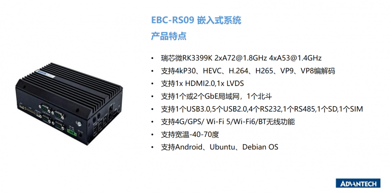 研華EBC-RS09是一款超高性價比的RISC嵌入式邊緣AI智能系統,搭載高性能瑞芯微RK-3399 6核心處理器,具備豐富的I/O及擴展能力,廣泛適用在自動化,醫療,零售等行業中!