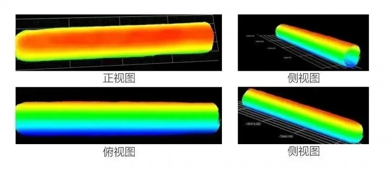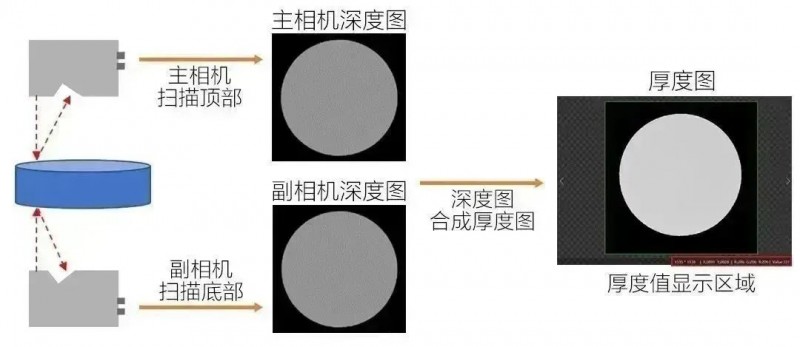 方案優(yōu)勢:通過雙相機(jī)對射拼接掃的方式描圓柱體兩個(gè)面,輸出圓柱體“厚度”圖像(兩張深度圖差分形成),在“厚度”圖像中可直接顯示圓柱體任意點(diǎn)位的厚度值,以及兩個(gè)平面的3D數(shù)據(jù)