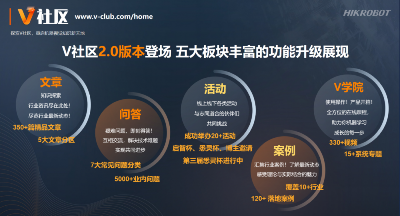 V社區升級至2.0版本,已形成文章、問答、活動、案例、V學院五大板塊,匯集350多篇精品文章、330多條講解及應用視頻、5000多個專業問題、120多個實踐案例、20多場活動,助力機器視覺愛好者快速學習成長。