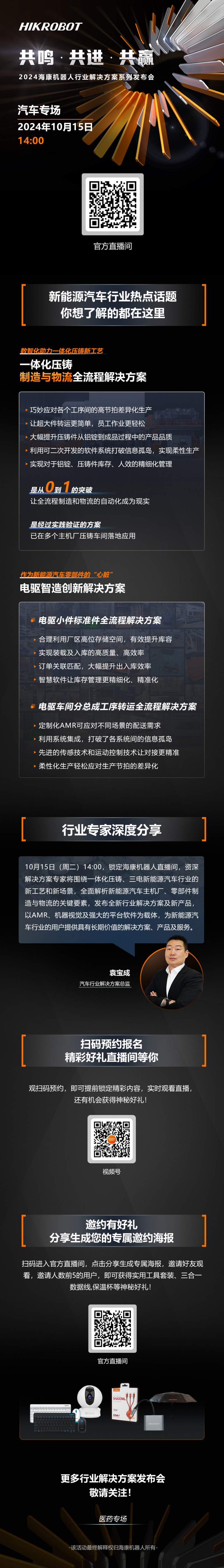 10月15日14:00 鎖定海康機(jī)器人直播間,資深汽車行業(yè)解決方案專家,將為您深度解析新能源汽車行業(yè)熱點(diǎn)話題、創(chuàng)新方案介紹、新品分享、實(shí)時答疑,干貨滿滿,更有精美好禮,等您來拿!