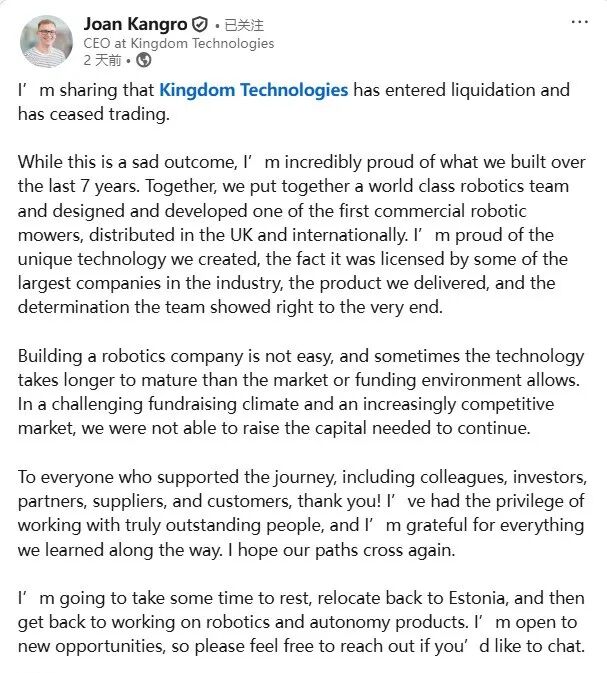 核心提示:1月23日,英國商用割草機器人廠商 Kingdom Technologies 宣布進入清算程序。其CEO發文表示,非常自豪曾組建起世界一流的機器人團