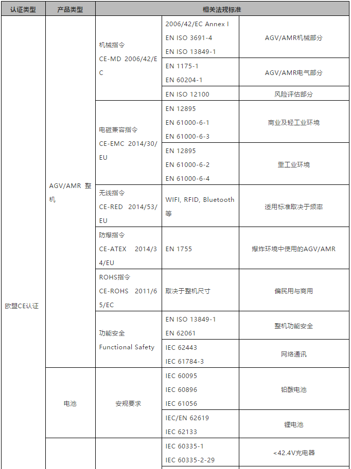 AGV/AMR整機(jī)隸屬于機(jī)械產(chǎn)品,全球各個國家和地區(qū)對于機(jī)械產(chǎn)品的進(jìn)口都有相關(guān)法規(guī)要求,用以保護(hù)人員的健康,財(cái)產(chǎn)和環(huán)境要求。同時,由于各國技術(shù)發(fā)展與社會發(fā)展水平不同,對于機(jī)械產(chǎn)品安全認(rèn)證要求,從法規(guī)標(biāo)準(zhǔn)體系,產(chǎn)品認(rèn)證范圍,到市場監(jiān)管體系均不一致,因此機(jī)械產(chǎn)品出口到不同的國家與地區(qū),涉及的認(rèn)證要求不一樣。相應(yīng)的AGV/AMR所用到的關(guān)鍵零部件,對應(yīng)不同市場也有相應(yīng)的法規(guī)標(biāo)準(zhǔn)要求。