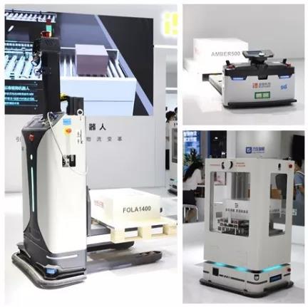 迦智科技智能無(wú)人叉車FOLA-1400-CDD(左),輕量級(jí)激光SLAM地面式自動(dòng)叉車AMBER 500(右上),高精度側(cè)叉物料取放機(jī)器人(右下)