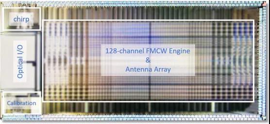 而第二代FMCW SoC芯片相比去年完成的第一代芯片,并行的FMCW計算單元數目提高4倍,高達128通道,除FMCW的功能外,芯片上同時集成其他關鍵的光信號處理單元,如信號光調頻、非線性補償等,單個芯片集成數千個光學器件,單芯片實現傳統光學系統需要上千倍尺寸和成本才有可能達到的功能,是全球目前集成度最高的硅光芯片之一。
