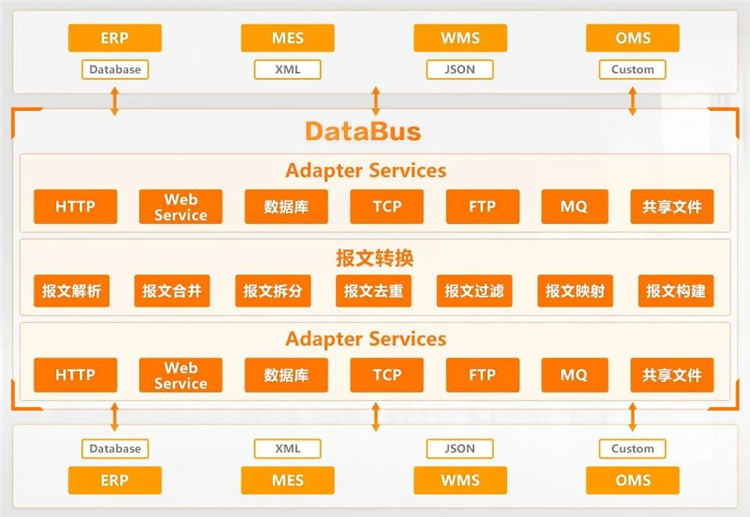DataBus提供多個業務系統之間數據交互能力,支持HTTP/HTTPS/WebService/數據庫中間表/FTP/共享文件夾等多種通訊方式,支持JSON/XML等多種報文格式。
