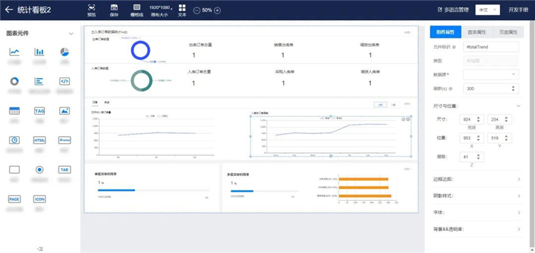 DataView提供豐富多樣的元件庫,支持用戶自定義配置頁面布局,關聯數據源后可動態展示可視化頁面。