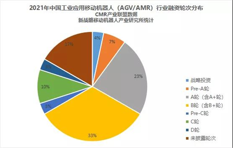 從融資輪次看,2021年工業(yè)應(yīng)用移動機器人領(lǐng)域,戰(zhàn)略融資1起,占比為4%;Pre-A輪2起,占比7%;A輪(含A+輪)7起,占比23%;B輪(含B+輪)10起,占比33%;Pre-C輪1起,占比3%;C輪3起,占比10%,D輪1起,占比3%;5起未披露輪次,占比17%。